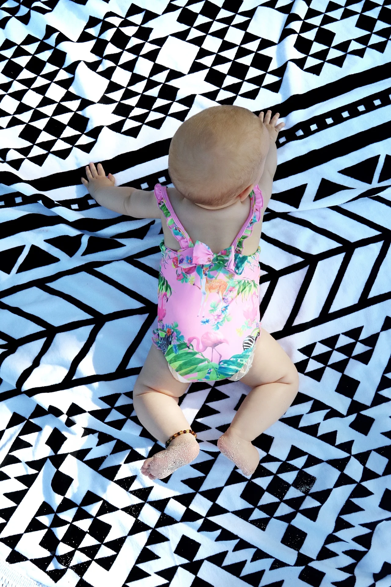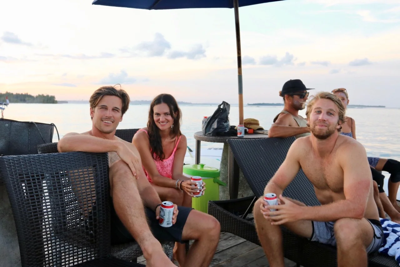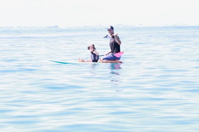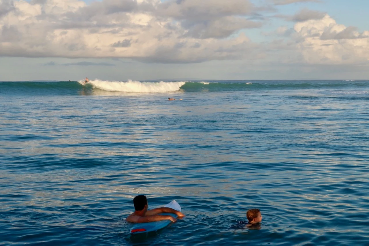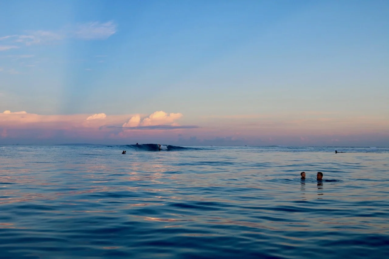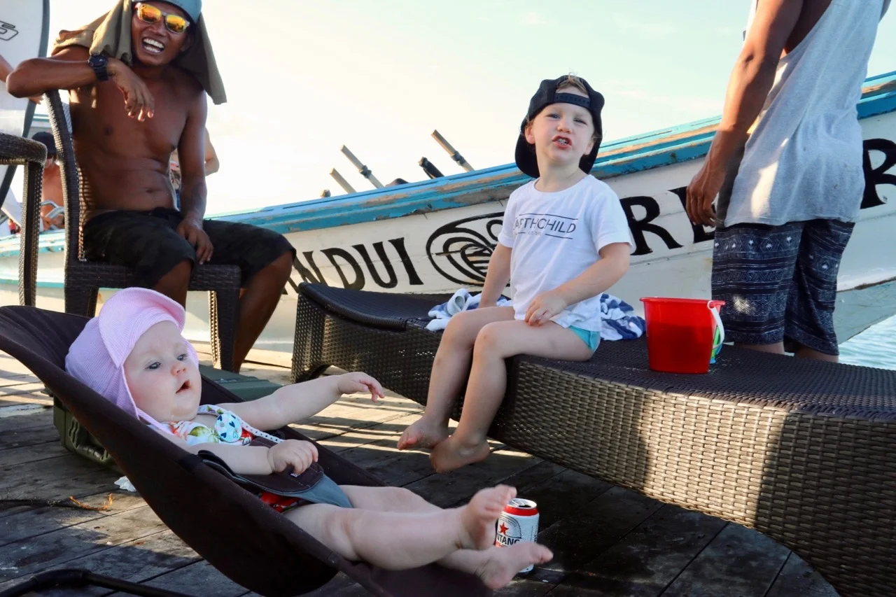 My favourite activity of all? Those sunset sessions on the pontoon. The resort has its own private pontoon set up out the front, about 300m off the beach. Its right next to 4Bobs, one of the most consistent and fun surf breaks in the area. We would all head out to the pontoon most days around 5pm with a few eskys full of drinks. We would have cruisy music playing, watch and/or surf super fun waves, swim in the warmest ocean waters, and share a few too many Bintangs, whilst the sun was setting and the most beautiful colours painted the skies around us. Noah came with us every evening and I swear it was his happy place. In and out of the water like a fish. Every night would get better than the one before and the icing on the cake was the full moon towards the end of our trip. Surfing with my hubby and best friends after the sun had set with a pastel-pink-coloured sky and the biggest, round and heavy, full moon on the horizon. Truly unforgettable.